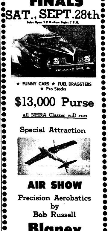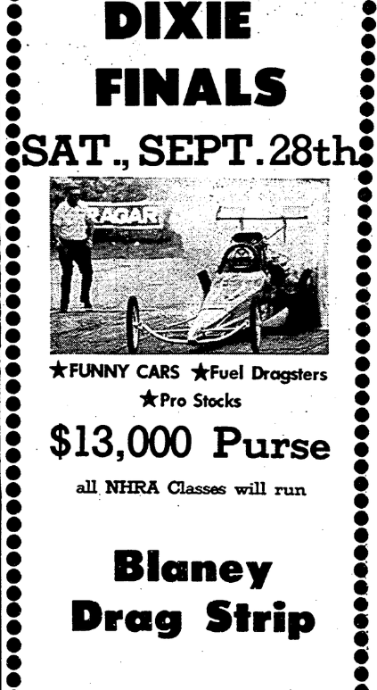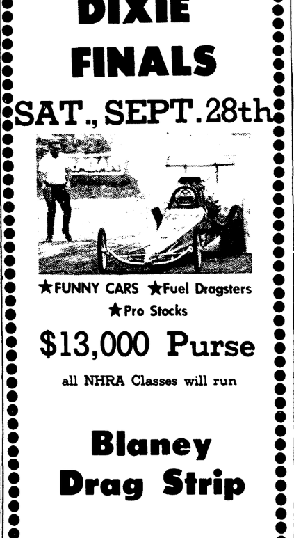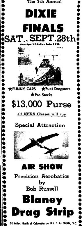 The 7th AnnualDixie Finals Saturday, September 28thGates Open 3 P.M. – Race Begins 7 P.M. *Funny Cars * Fuel Dragsters * Pro Stocks $13,000 Purse All NHRA Classes will run. Special AttractionAIR SHOWPrecision Aerobatics by Bob Russell Blaney Drag Strip20 Miles North Of Columbia on U. S. 1 At Elgin, S. C. Continue reading The 7th Annual Dixie Finals
