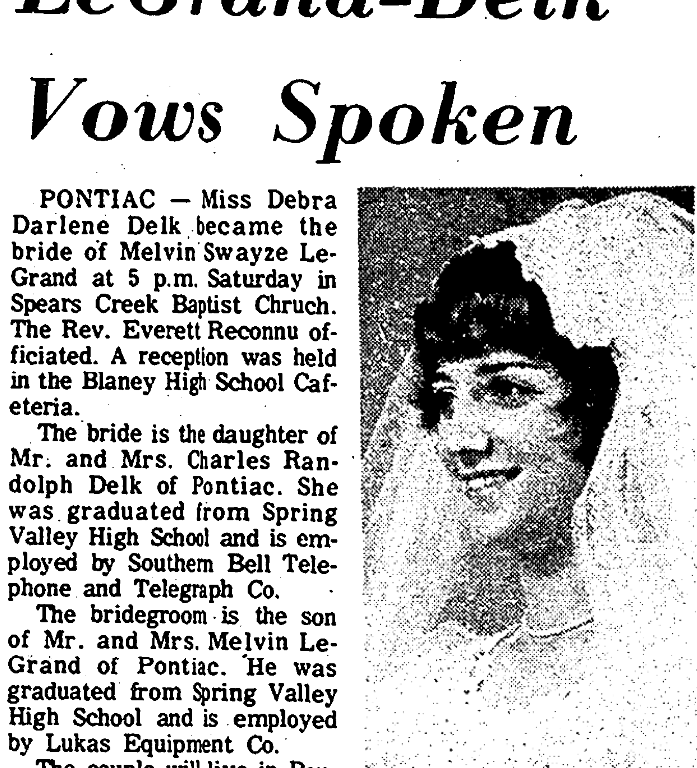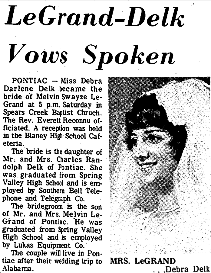 PONTIAC – Miss Debra Darlene Delk became the bride of Melvin Swayze LeGrand at 5 p.m. Saturday in Spears Creek Baptist Church. The Rev. Everett Reconnu officiated. A reception was held in the Blaney High School Cafeteria.