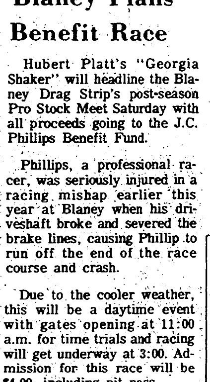 Hubert Platt’s “Georgia Shaker” will headline the Blaney Drag Strip’s post-season Pro Stock Meet Saturday with all proceeds going to the J. C. Phillips Benefit Fund.