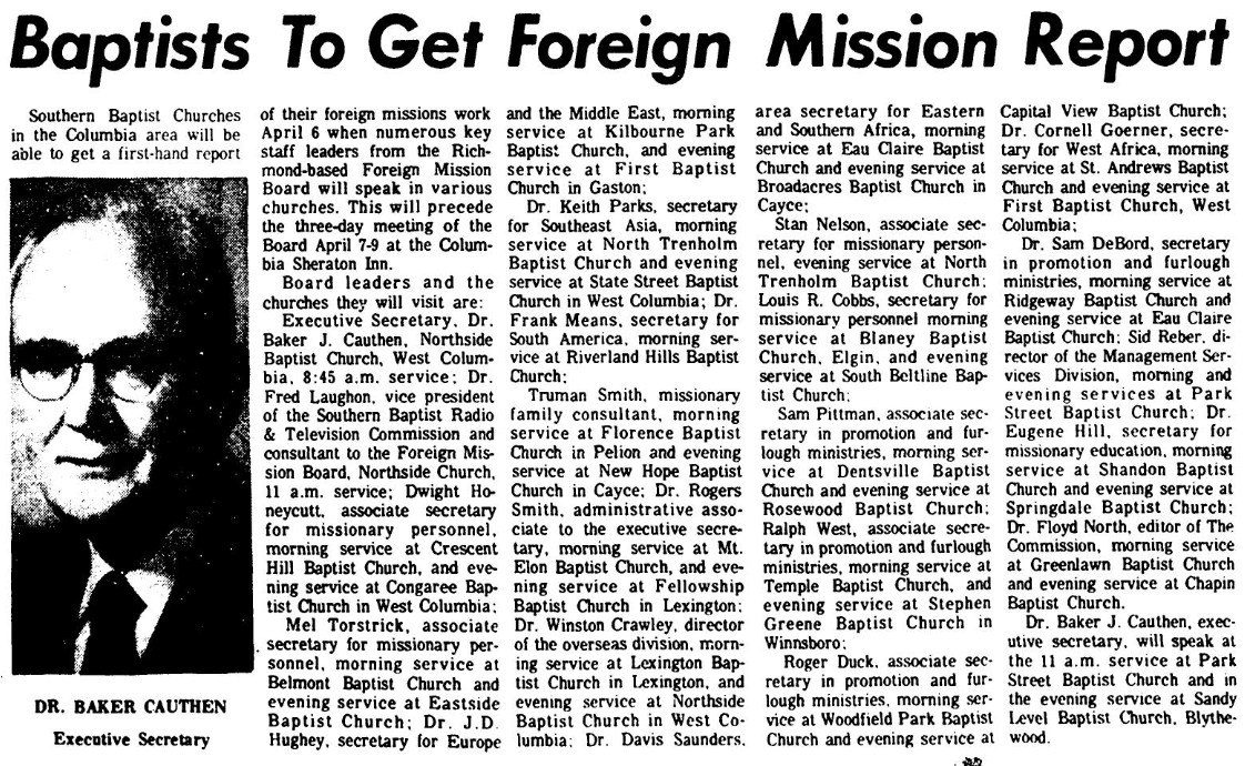 Executive Secretary, Dr. Baker J. Cauthen, Northside Baptist Church, West Columbia, 8:45 a.m. service; Dr. Fred Laughon, vice president of the Southern Baptist Radio & Television Commission and consultant to the Foreign Mission Board, Northside Church, 11 a.m. service; dwight Honeycutt, associate secretary for missionary personnel, morning service at Crescent Hill Baptist Church, and evening service at Congaree Baptist Church in West Columbia;