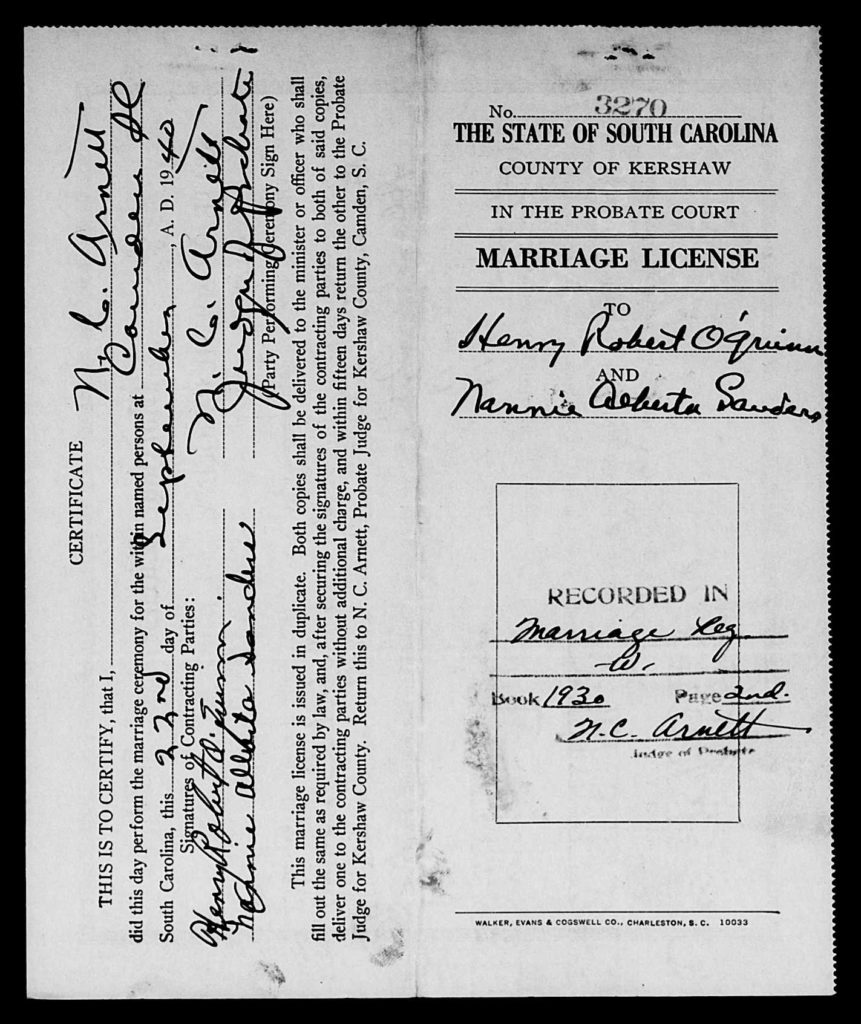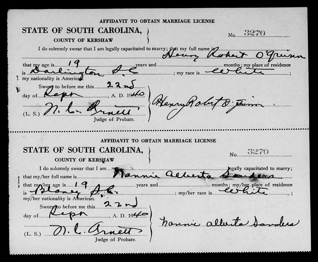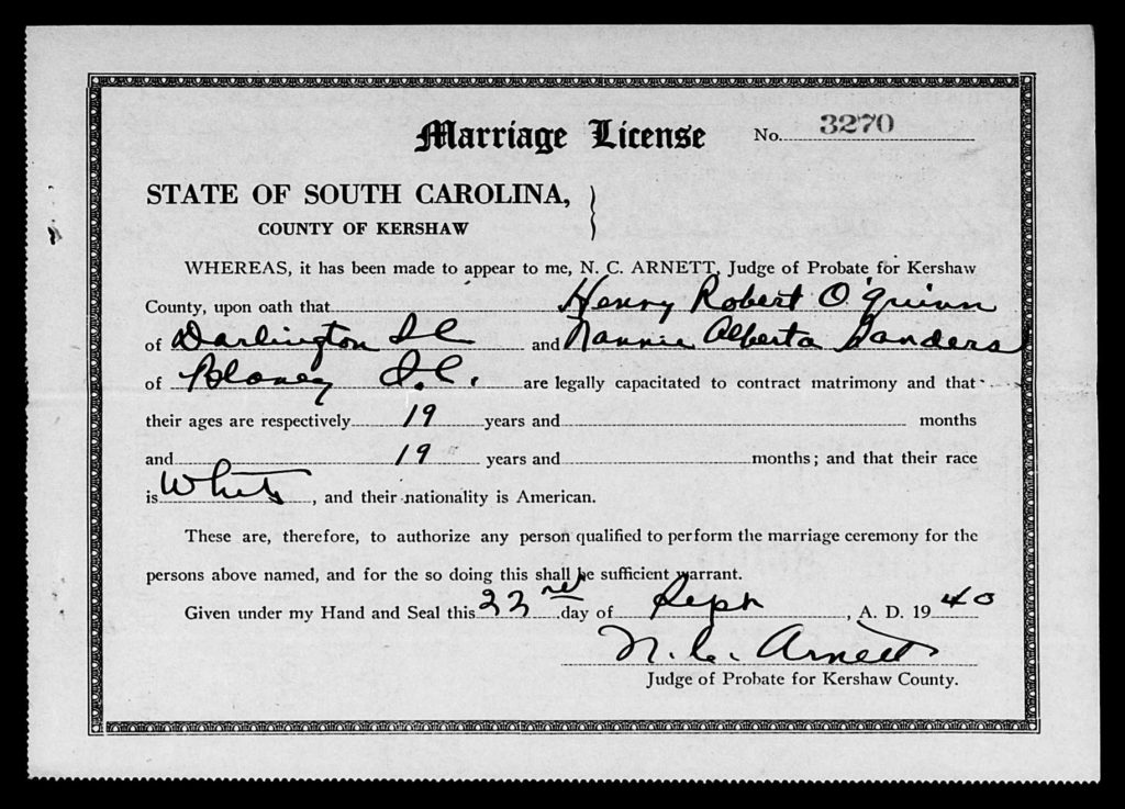 On September 22, 1940, Henry Robert O’Quinn (19) married Nannie Alberta Sanders (19) in Kershaw County, South Carolina.