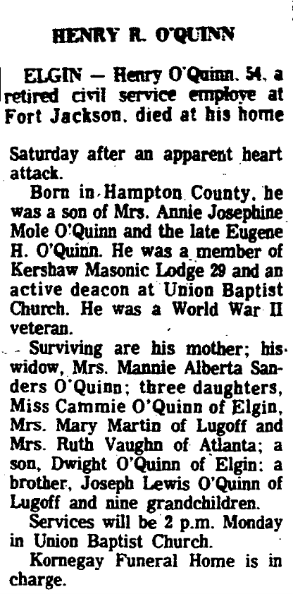 ELGIN – Henry O’Quinn, 54, a retired civil service employee at Fort Jackson, died at his home Saturday, December 20, 1975 after an apparent heart attack.