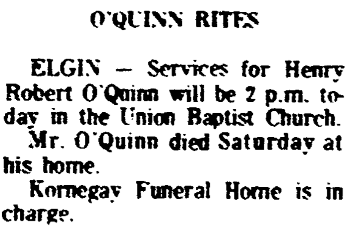 On May 18, 2019, Henry Robert O’Quinn was listed as the deceased father in the obituary of Ruth O’Quinn Coyle.