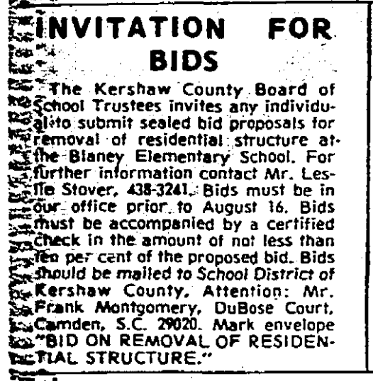 The Kershaw County Board of School Trustees invites any individual to submit sealed bid proposals for removal of residential structure at the Blaney Elementary School. For further information contact Mr. Leslie Stover, 438-3241. Bids must be in our office prior to August 16. Bids must be accompanied by a certified check in the amount of not less than ten per cent of the proposed bid. Bids should be mailed to School District of Kershaw County, Attention: Mr. Frank Montgomery, DuBose Court, Camden, S. C. 29020. Mark envelope “BID ON REMOVAL OF RESIDENTIAL STRUCTURE.”