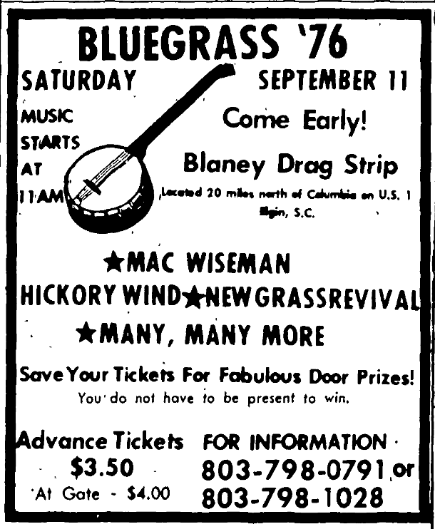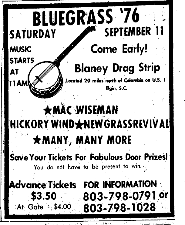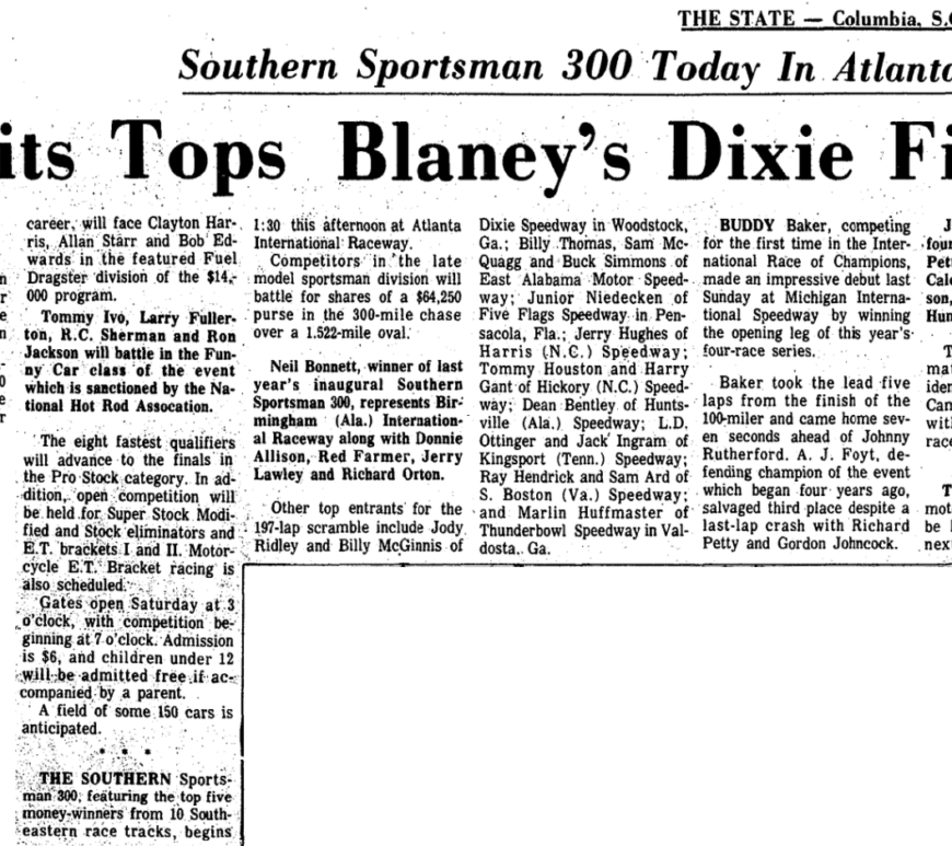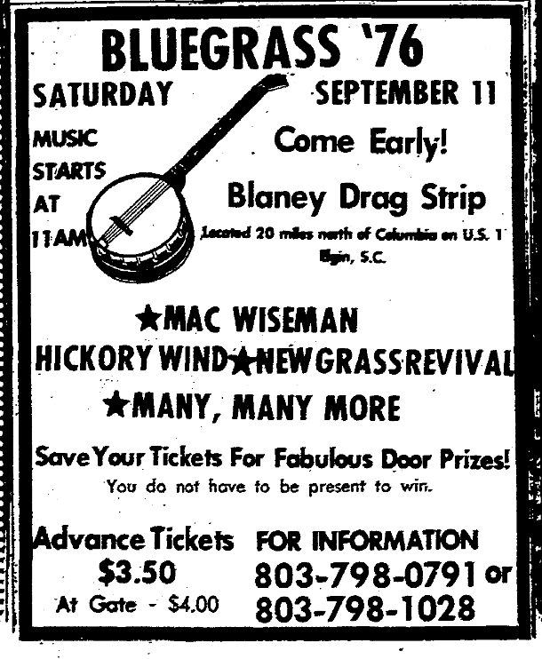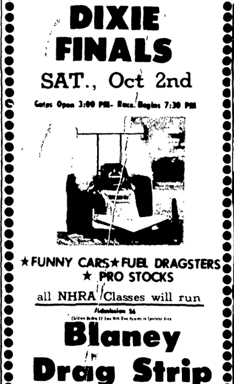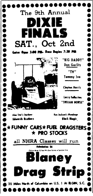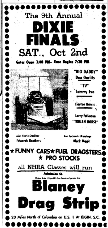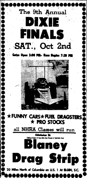 The 9th Annual Dixie Finals Saturday, October 2nd Gates Open 3:00 PM – Race Begins 7:30 PM *Funny Cars *Fuel Dragsters *Pro Stocks All NHRA Classes will run Admission $6 Children under 12 Free with Own Parents in spectator area. Blaney Drag Strip Located 20 miles north of Columbia on U. S. 1 Elgin, S. C. Continue reading The 9th Annual Dixie Finals