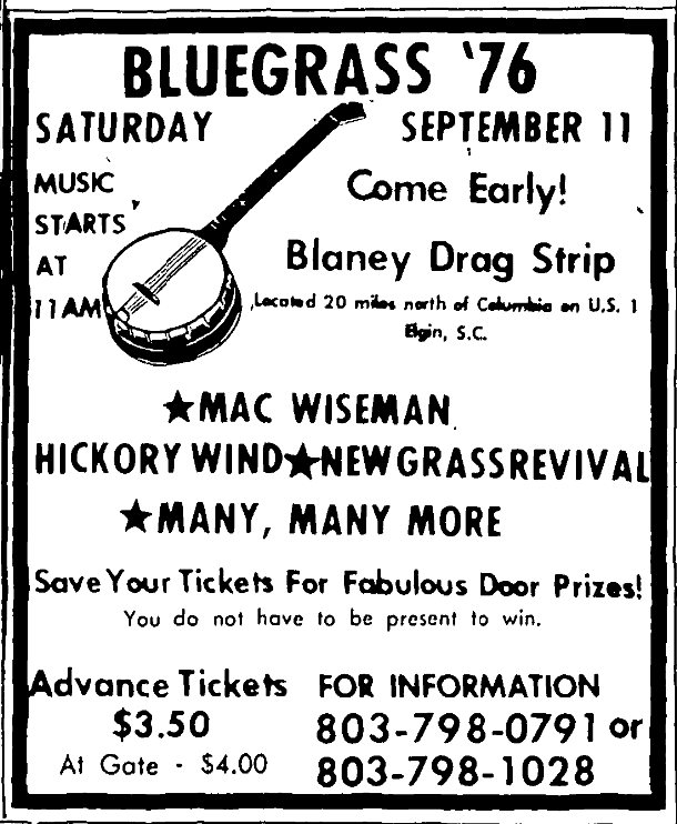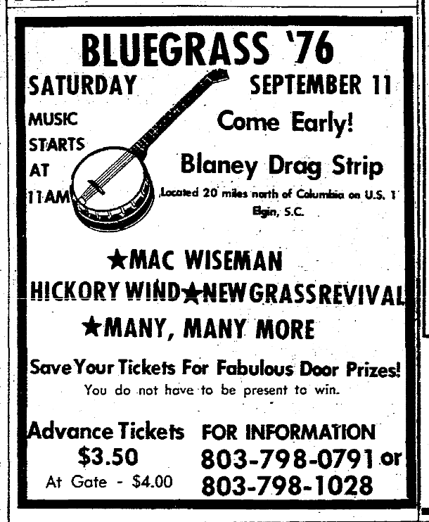 Bluegrass ’76Saturday September 11 Come Early Music Starts at 11 AM Blaney Drag Strip Located 20 miles norht of Columbia on U. S. 1 Elgin, S. C. *MAC WISEMAN*HICKORY WIND*NEW GRASSREVIVAL*MANY, MANY MORE Save Your Tickets For Fabulous Door Prizes!You do not have to be present to win. Advance Tickets $3.50At Gate – $4.00 For Information803-798-0791 or803-798-1028 Continue reading Bluegrass ’76