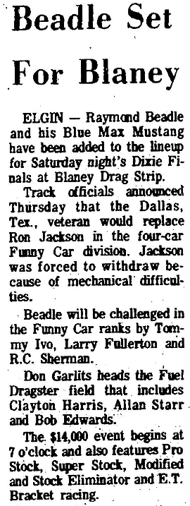 ELGIN – Raymond Beadle and his Blue Max Mustang have been added to the lineup for Saturday night’s Dixie Finals at Blaney Drag Strip.