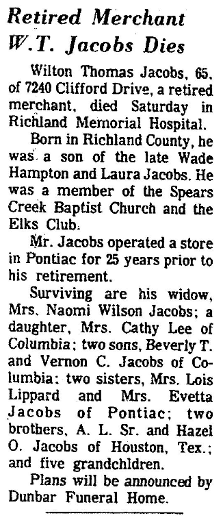 Surviving are his widow, Mrs. Naomi Wilson Jacobs; a daughter, Mrs. Cathy Lee of Columbia; two sons, Beverly T. and Vernon C. Jacobs of Columbia; two sisters, Mrs. Lois Lippard and Mrs. Evetta Jacobs of Pontiac; two brothers, A. L. Sr. and Hazel O. Jacobs of Houston, Tex.; and five grandchildren.