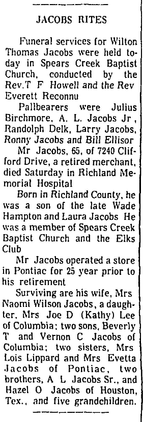 Surviving are his widow, Mrs. Naomi Wilson Jacobs; a daughter, Mrs. Joe D (Kathy) Lee of Columbia; two sons, Beverly T. and Vernon C. Jacobs of Columbia; two sisters, Mrs. Lois Lippard and Mrs. Evetta Jacobs of Pontiac; two brothers, A. L. Jacobs Sr. and Hazel O. Jacobs of Houston, Tex.; and five grandchildren.