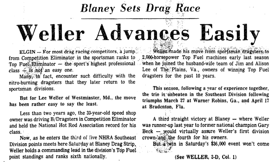 ELGIN – Don Powell and Warren Burnett Captured the top fuel division of the National Hot Rod Association drag races Saturday night at Blaney Drag Strip as Bob Strauss finished in the runner up spot. Bob Barry bested Murph McKinney in the funny car Category and Don Nicolson edged Bob Ingles in the pro stock class. Jeff Richardson closed in front of Chase Knight to … Continue reading Powell, Burnett Win Drags