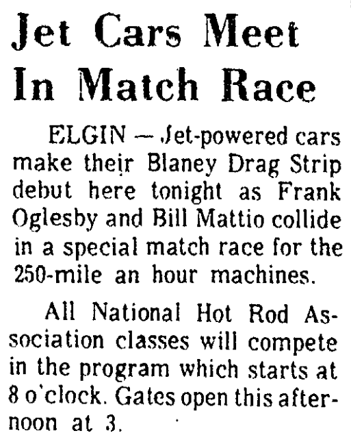 ELGIN – Jet-powered cars make their Blaney Drag Strip debut here tonight as Frank Oglesby and Bill Mattio collide in a special match race for the 250-mile an hour machines.