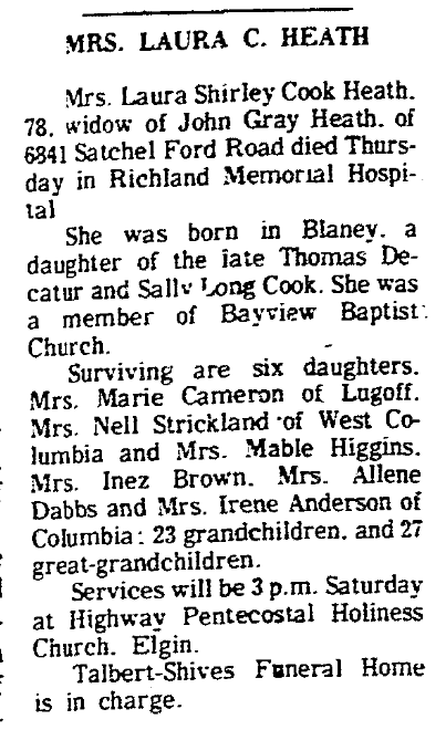 Mrs. Laura Shirley Cook Heath, 78, widow of John Gray Heath, of 6841 Satchel Ford Road died Thursday, September 29, 1977, in Richland Memorial Hospital.