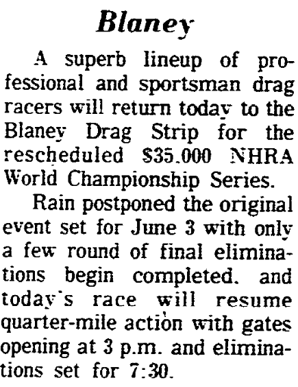 Rain postponed the original event set for June 3 with only a few round of final elimination begin completed, and today’s race will resume quarter-mile action with gates opening at 3 p.m. and eliminations set for 7:30.