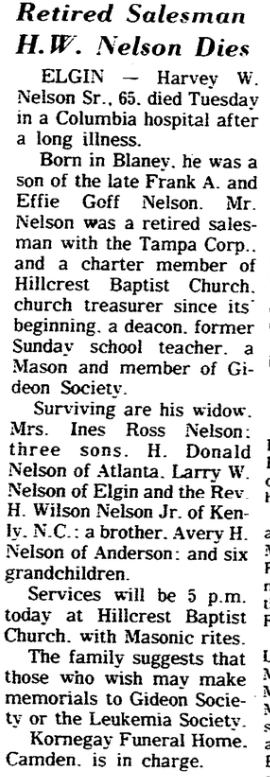 Surviving are his wife, Mrs. Ines Ross Nelson; three sons, H. Donald Nelson of Atlanta, Larry W. Nelson of Elgin and the Rev. H. Wilson Nelson Jr. of Kenly, N. C.; a brother, Avery H. Nelson of Anderson; and six grandchildren.