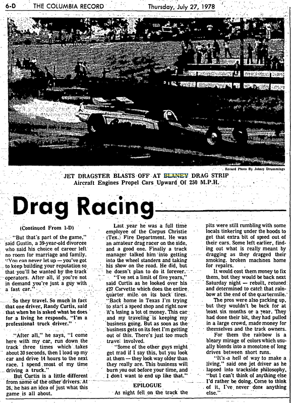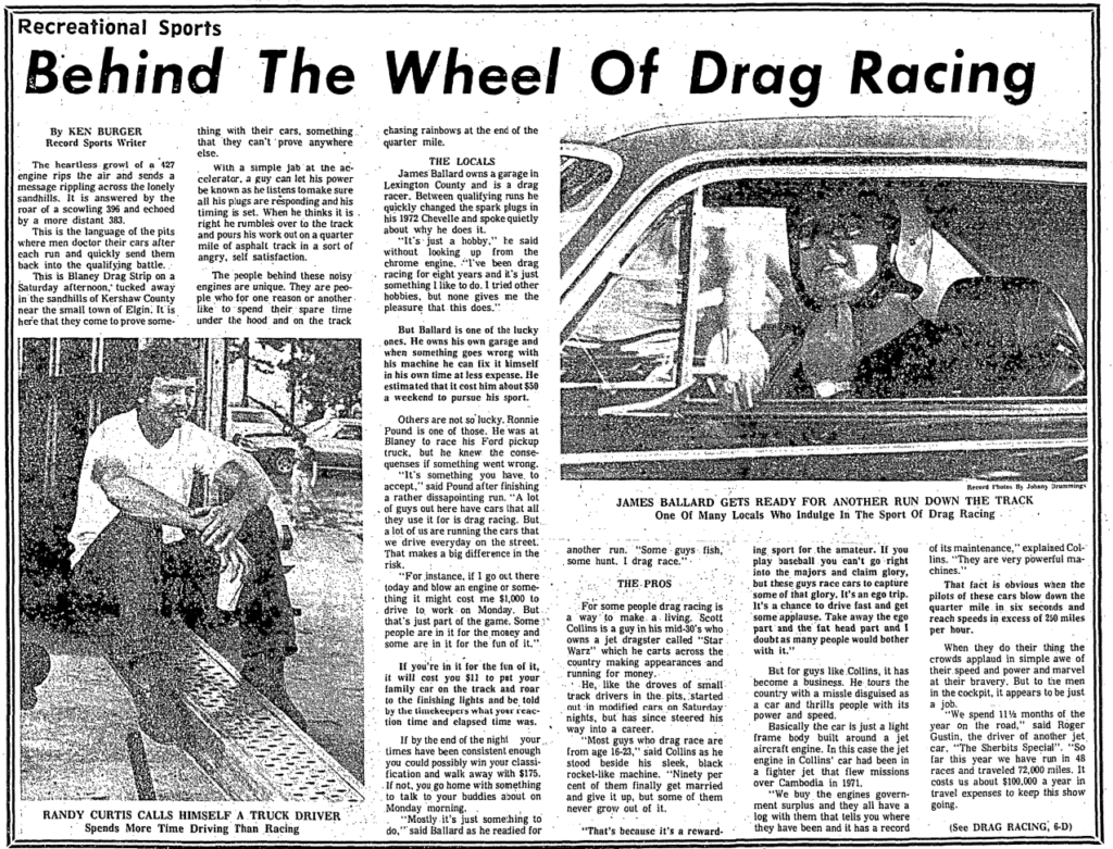 “I’ve set a limit of five years,” said Curtis as he looked over his 427 Corvette which does the entire quarter mile on its back tires. “Back home in Texas I’m trying to start a speed shop and right now it’s losing a lot of money. This car and my traveling is keeping my business going. But as soon as the business gets on its feet I’m getting out of this. There’s just too much travel involved.
