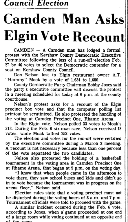 Nelson’s protest asks for a recount of the Elgin precinct box vote and that the computer polling list printout be scrutinized. He also protested the handling of the voting at Camden Precinct one, Rhame Arena.