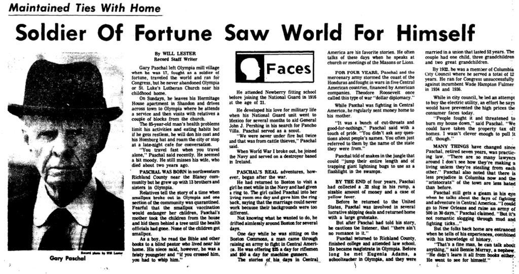 Gary Paschal left Olympia mill village when he was 17, fought as a soldier of fortune, traveled the world and ran for congress, but he never abandoned Olympia or St. Luke’s Lutheran Church near his childhood home.