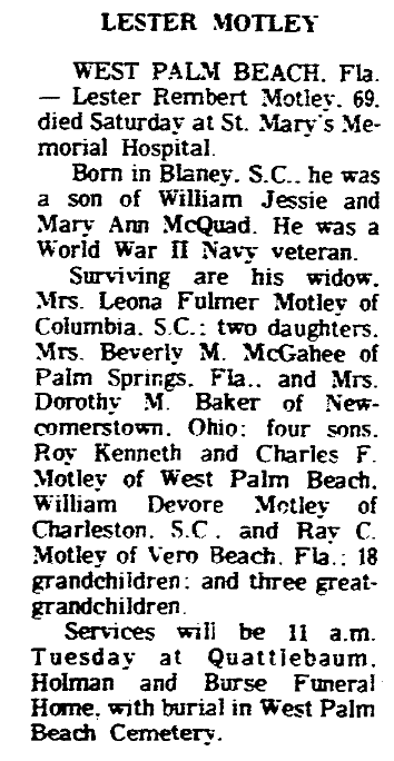 Surviving are his widow, Mrs. Leona Fulmer Motley of Columbia, S. C.; two daughters, Mrs. Beverly M. McGahee of Palm Springs, Fla., and Mrs. Dorothy M. Baker of Newcomerstown, Ohio; four sons, Roy Kenneth Motley and Charles F. Motley fo West Palm Beach, William Devore Motley of Charleston, S. C. and Ray C. Motley of Vero Beach, Fla.; 18 grandhcildren; and three great grandchildren.