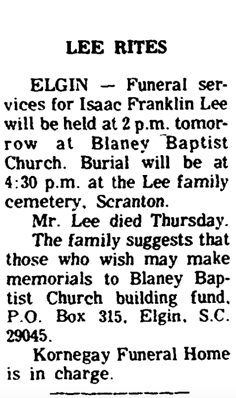 ELGIN – Funeral services for Isaac Franklin Lee will be held at 2 p.m.tomorrow, September 16, 1979 at Blaney Baptist Church. Burial will be at 4:30 p.m. at the Lee family cemetery. Scraton.