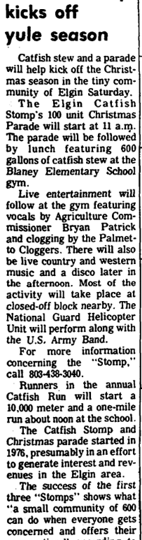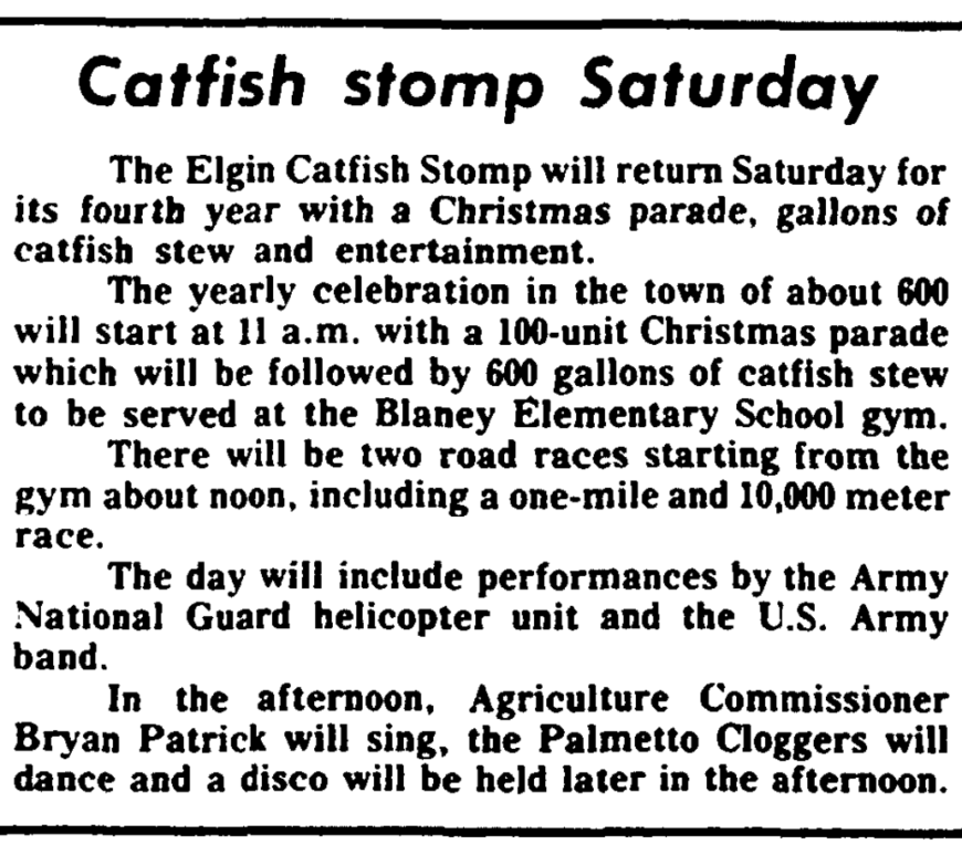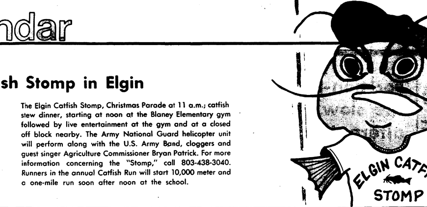 The Elgin Catfish Stomp Saturday begins with a Christmas parade at 11 a.m. Some 600 gallons of Catfish stew will be served at noon in the Blaney School cafeteria. The Catfish Stomp Run will get under way at 12:30 for the one-mile fun run, at 1 p.m. for the 10,000 meter event. Free musical entertainment will include country and western and gospel music, folk singing, … Continue reading The Elgin Catfish Stomp