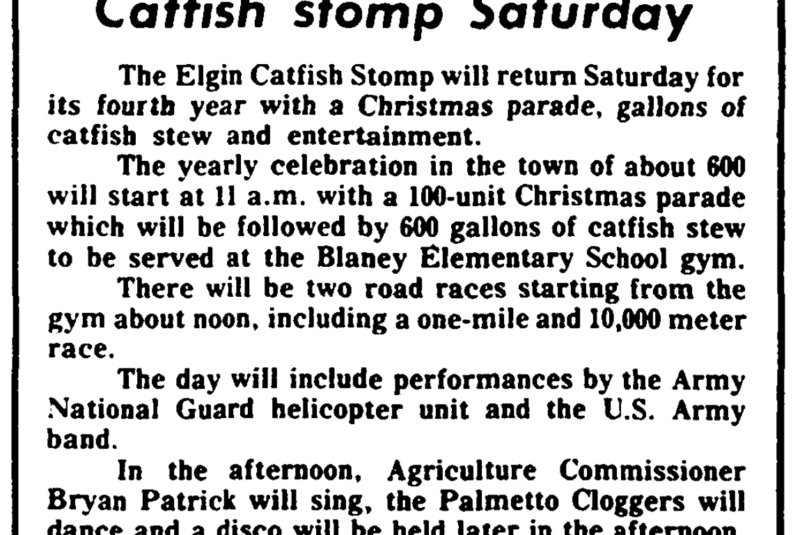 The Elgin Catfish Stomp will return Saturday for its fourth year with a Christmas parade. gallons of catfish stew and entertainment.