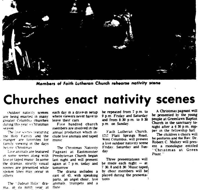 Faith Lutheran Church, 1717 Platt Spring Road, West Columbia, will present a live outdoor nativity scene Friday, Saturday and Sunday.