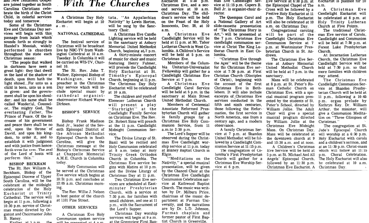 The Rt. Rev. William A. Beckham, Bishop of the Episcopal Diocese of Upper South Carolina, will be the celebrant at the midnight celebration of the HOly Eucharist at Trinity Cathedral. The service will begin at 11 p.m. following a 10:30 p.m. service of Christmas music directed by Organist and Choirmaster John B. Haney.