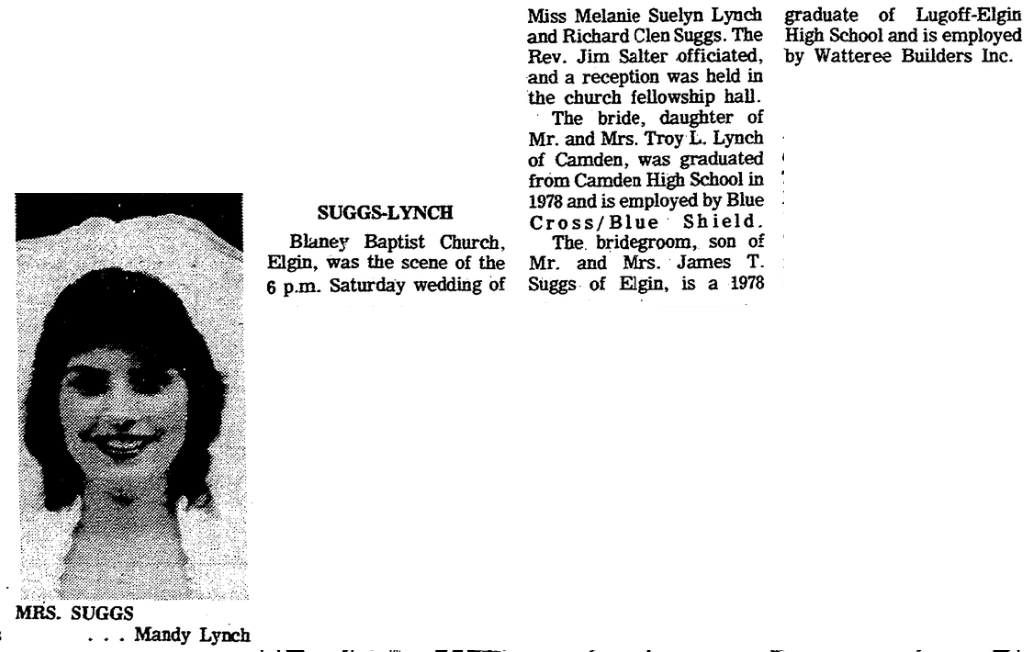 Blaney Baptist Church, Elgin, was the scene of the 6 p.m. Saturday wedding of Miss Melanie Suelyn Lynch and Richard Clen Suggs. The Rev. Jim Slater officiated, and a reception was held in the church fellowship hall.