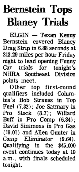 ELGIN – Texan Kenny Bernstein covered Blaney Drag Strip in 6.88 seconds at 213.29 miles per hour Friday night to lead opening Funny Car trails for tonight’s NHRA Southeast Division points meet. Other top first-round qualifiers included Columbia’s Bob Strauss in Top Fuel (7.32); Joe Satmary in Pro Stock (8.7); Willard Buff in Pro Comp (6.84); David Simmons in Pro Gas (10.01) and allen Gunter … Continue reading Bernstein Tops Blaney Trails
