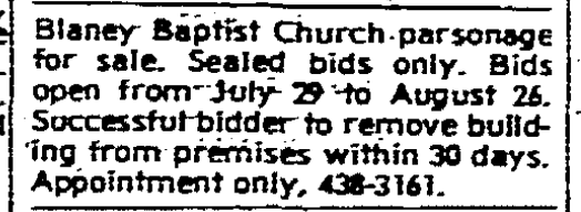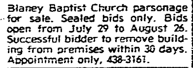 Blaney Baptist Church parsonage for sale. Sealed bids only. Bids open from July 29 to August 26. Successful bidder to remove building from premises within 30 days. Appointment only, 438-3161. Continue reading Homes For Sale