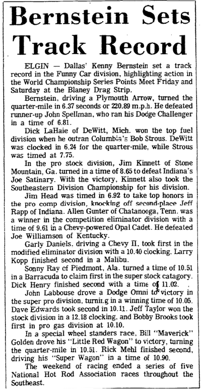 ELGIN- Dallas’ Kenny Bernstein set a track record in the Funny Car division, highlighting action in the World Championship Series Points Meet Friday and Saturday at the Blaney Drag Strip. Bernstein, driving a Plymouth Arrow, turned the quarter-mile in 6.37 seconds or 220.89 m.p.h. He defeated runner-up John Spellman, who ran his Dodge Challenger in a time of 6.81. Dick LaHaie of DeWitt, Mich, won … Continue reading Bernstein Sets Track Records