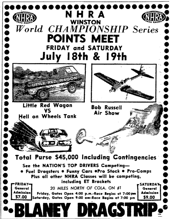 NHRA Winston World Championship Series Points Meet Friday and Saturday July 18th & 19th Little Red WagonVSHell on Wheels Tank Bob RussellAir Show Total Purse $45,000 Including Contingesncies See the NATION’S TOP DRIVER competing – Full Dragsters – Funny Cars – Pro Stock – Pro-Comps Plus all other NHRA Classes will be competing, including ET Brackets 20 Miles North of Cola. on #1 Friday General … Continue reading NHRA