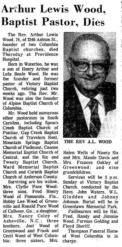 Born in Waterloo, he was a son of Henry Arthur and Lula Beale Wood. He was the founder and former pastor of Victory Baptist Church, retiring just two weeks ago. The Rev. Mr. Wood was also the founder of Alpine Baptist Church of Columbia.