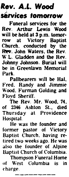 Funeral services for the Rev. Arthur Lewis Wood will be held at 3 p.m. tomorrow at Victory Baptist Church, conducted by the Rev. John Waters, the Rev. W. L. Gladden and the Rev. Johnny Johnson. Burial will be in the Greenlawn Memorial Park.