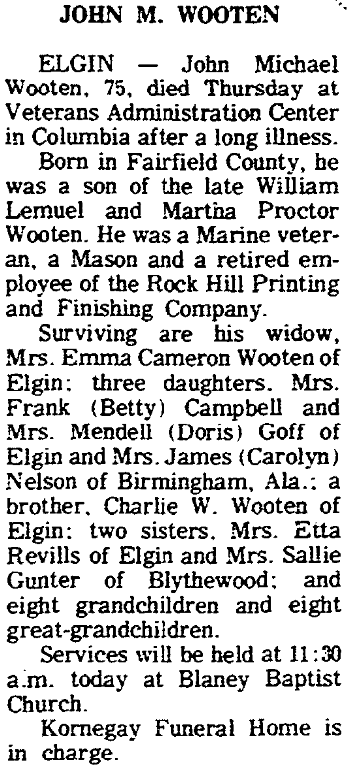 Surviving are his wife, Mrs. Emma Cameron Wooten; three daughters, Mrs. Frank (Betty) Campbell and Mrs. Mendell (Doris) Goff of Elgin and Mrs. James (Carolyn) Nelson of Birmingham, Alabama; a brother, Charlie W. Wooten of Elgin; two sisters, Mrs. Etta Revills of Elgin and Mrs. Sallie Gunter of Blythewood; and eight grandchildren and eight great-grandchildren.
