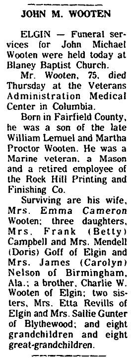 Born in Fairfield County, he was a son of the late William Lemuel Wooten and Martha Proctor Wooten. He was a Marine veteran, a Mason and a retired employee of the Rock Hill Printing and Finishing Co.