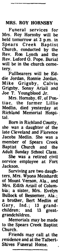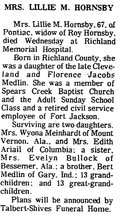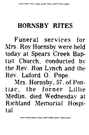 On February 26, 1967, Mrs. Lillie Medlin Hornsby was mentioned as the living wife in the obituary of Roy (Chuck) Hornsby.