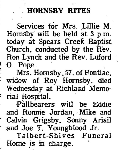 Mrs. Hornsby, 57, of Pontiac, widow of Roy Hornsby, died Wednesday at Richland Memorial Hospital.