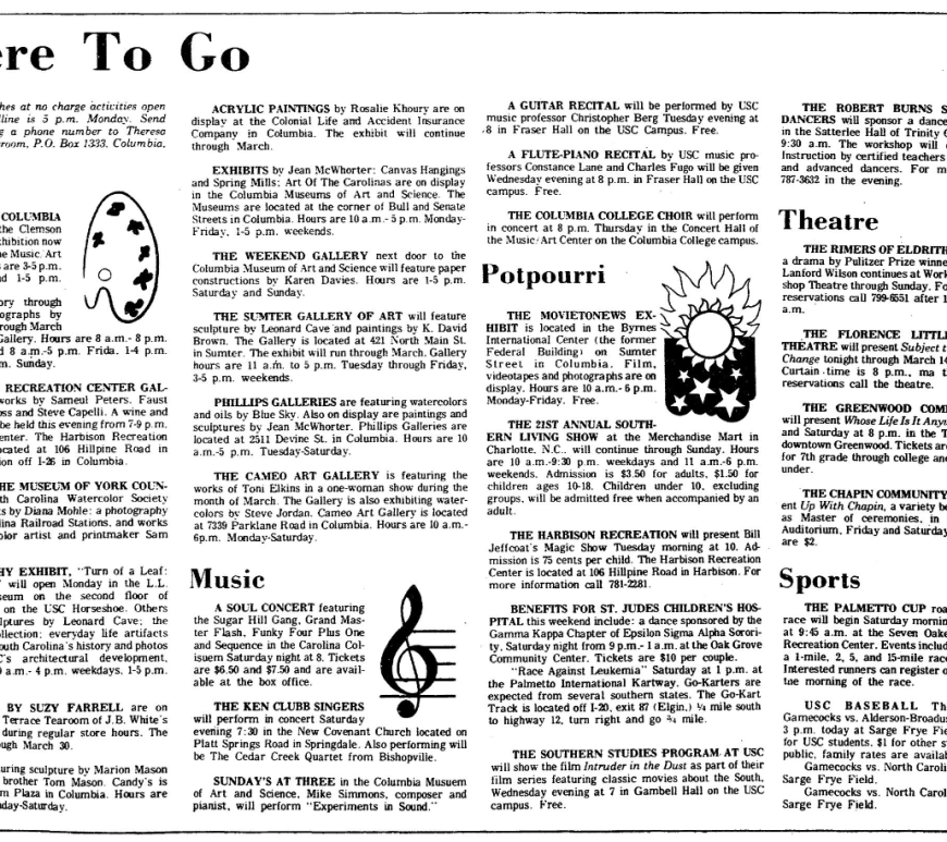 The State publishes at no charge activities open to the public. Deadline is 5 p.m. Monday. Send information including a phone number to Theresa Deilinger, State Newsroom, P. O. Box 1333. Columbia, S. C. 29202. Art EXHIBITS AT COLUMBIA COLLEGE include: the Clemson University Faculty Exhibition now through March 27 in the Music Art Center Gallery Hours are 3-5p.m. Monday-Thursday and 1-5 p.m. Friday Columbia’s … Continue reading Where To Go