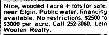 Nice, wooded 1 acre + lots for sale, near Elgin. Public water, financing available. No restrictions. $2506 to $3000 per acre. Call 252-3060. Lem Wooten Realty.