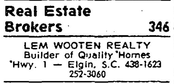 Today in HistoryReal Estate Brokers 346 LEM WOOTEN REALTYBuilder of Quality Homes‘Hwy. 1 – Eigin, S.C. 438-1623252-3060 March 5, 1981 Columbia Record (published as The Columbia Record) Columbia, South CarolinaPage 42