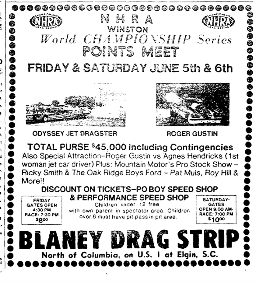 TOTAL PURSE $45,000 including Contingencies also special attraction- Roger Gustin vs Agns Hendricks (1st woman jet car driver). Plus: Mountain Motor’s Pro Stock Show – Ricky Smith & THe Oak Ridge Boys Ford – Pat Muis, Roy Hill & More!!