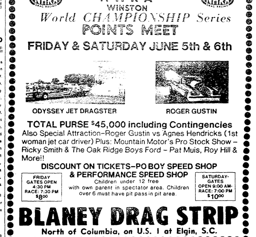 TOTAL PURSE $45,000 including Contingencies also special attraction- Roger Gustin vs Agns Hendricks (1st woman jet car driver). Plus: Mountain Motor’s Pro Stock Show – Ricky Smith & THe Oak Ridge Boys Ford – Pat Muis, Roy Hill & More!!