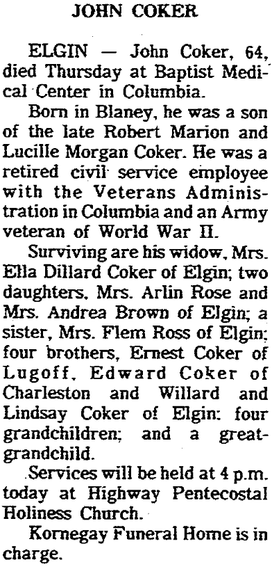 Surviving are his widow, Mrs. Ella Dillard Coker of Elgin; two daughters, Mrs. Arlin Rose and Mrs. Andrea Brown of Elgin; a sister, Mrs. Flem Ross of Elgin; four brothers, Ernest Coker of Lugoff, Edward Coker of Charleston and Willard Coker and Lindsay Coker of Elgin; four grandchildren; and a great grandchild.