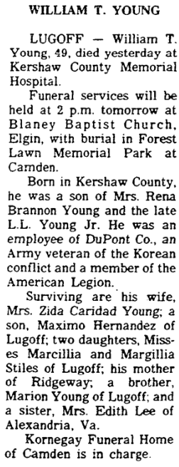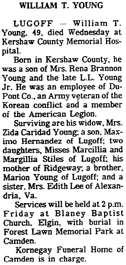 Surviving are his wife, Mrs. Zida Caridad Young; a son, Maximo Hernandez of Lugoff; two daughters, Misses Marcilla Stiles and Magillia Stiles of Lugoff; his mother of Ridgeway; a brother, Marion Young of Lugoff; and a sister, Mrs. Edith Lee of Alexandria, Va.