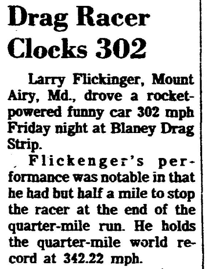 Flickenger’s performance was notable in that he had but half a mile to stop the racer at the end of the quarter-mile run. He holds the quarter-mile world record at 342.22 mph.