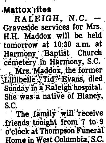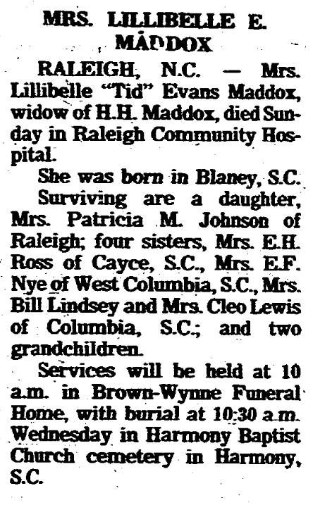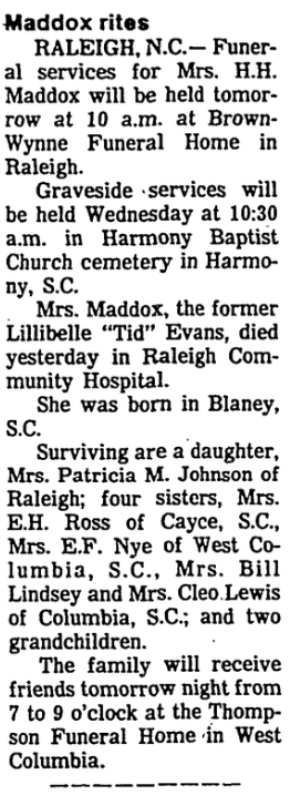 Mrs. H. H. Maddox, the former Lillibelle “Tid” Evans, died June 6, 1982 in Raleigh Community Hospital.