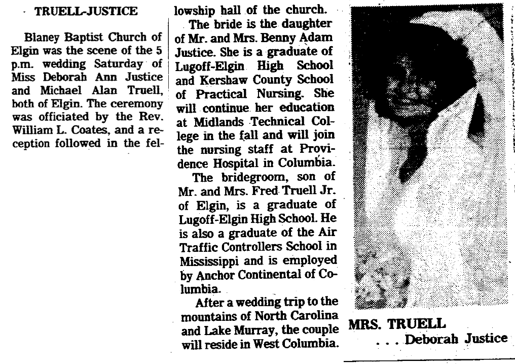 The bridegroom, son of Mr. and Mrs. Fred Truell Jr. (Dorothy Miles Truell) of Elgin, is a graduate of Lugoff-Elgin High School. He is also a graduate of the Air Traffic Controllers School in Mississippi and is employed by Anchor Continental of Columbia.