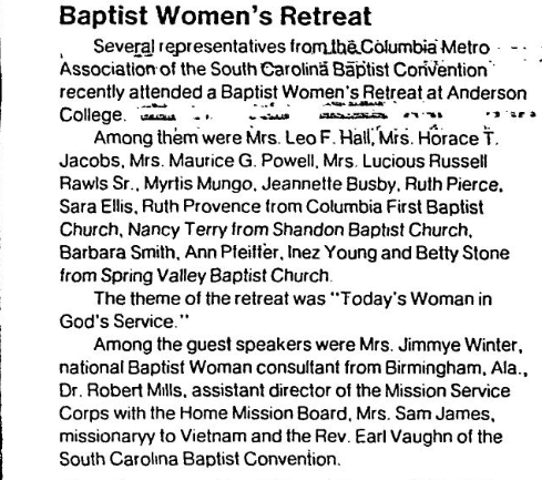 Among them were Mrs. Leo F. Hall. Mrs. Horace T. Jacobs, Mrs. Maurice G. Powell, Mrs. Lucious Russell Rawls, Sr., Mytris Mungo, Jeannette Busby, Ruth Pierce, Sara Ellis, Ruth Provence from Columbia First Baptist Church, Nancy Terry from Shandon Baptist Church, Barbara Smith, Ann Pleiffer, Inez Young, and Betty Stone from Spring Valley Baptist Church.