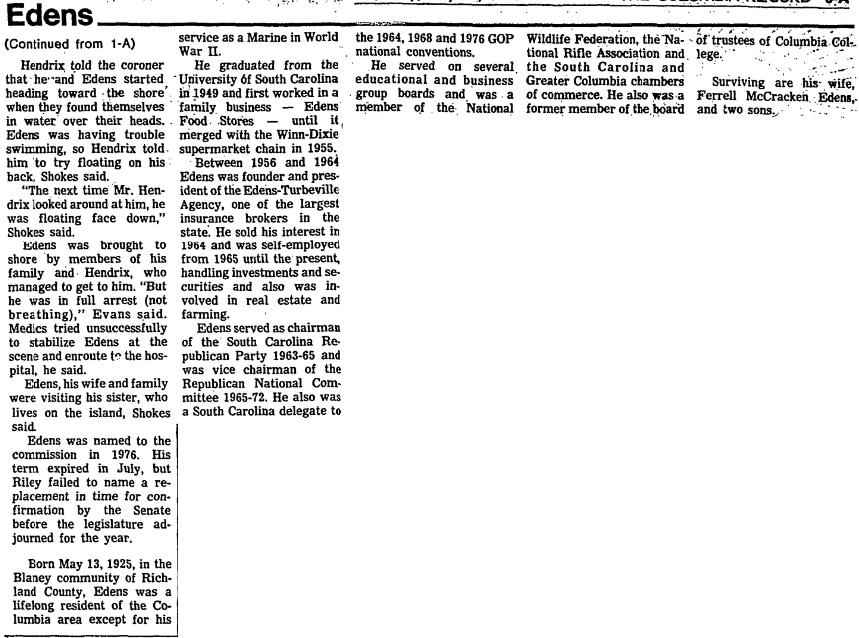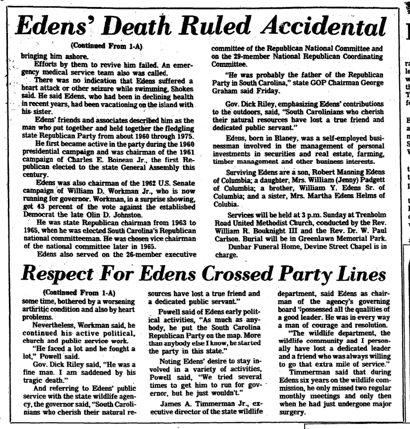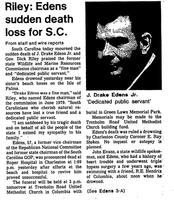 “Drake Edens was a fine man.” said Riley, who named Edens chairman of the commission in June 1979. “South Carolinians who cherish natural resources have lost a true friend and a dedicated public servant.